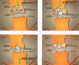 Le vescicole sinaptiche del neurone situato sul versante superiore della fessura sinaptica contengono le molecole per la neurotrasmissione elaborate nel corpo cellulare. Sul neurone del versante opposto invece sono evidenziati schematicamente i recettori, le strutture specializzate per legarsi chimicamente con il neurotrasmettitore.