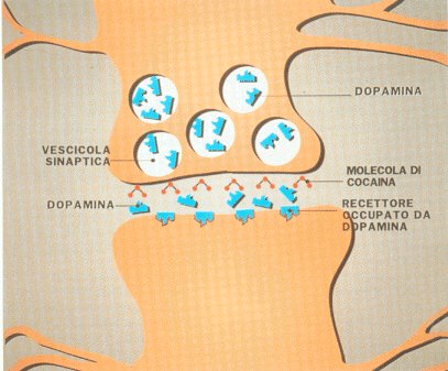 La cocaina impedisce il riassorbimento della dopamina da parte del neurone presinaptico dopo la neurotrasmissione. Si determina un accumulo di dopamina nella fessura sinaptica e una sovrastimolazione del neurone postsinaptico.
